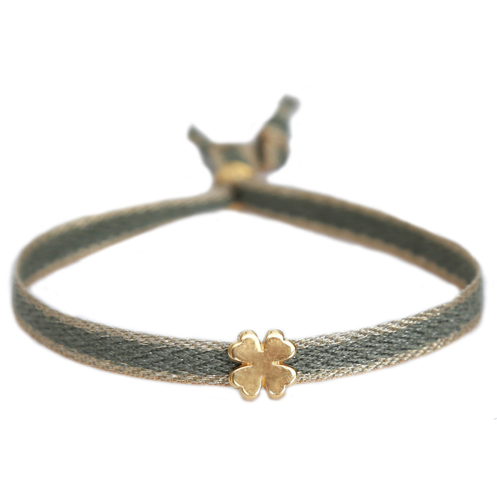 Fein gewebtes Armband in grüner Farbe mit goldenen Rändern und einem goldenen Kleeblatt-Anhänger. Mithilfe der Goldperle können Sie das Armband auf die gewünschte Größe verschieben.