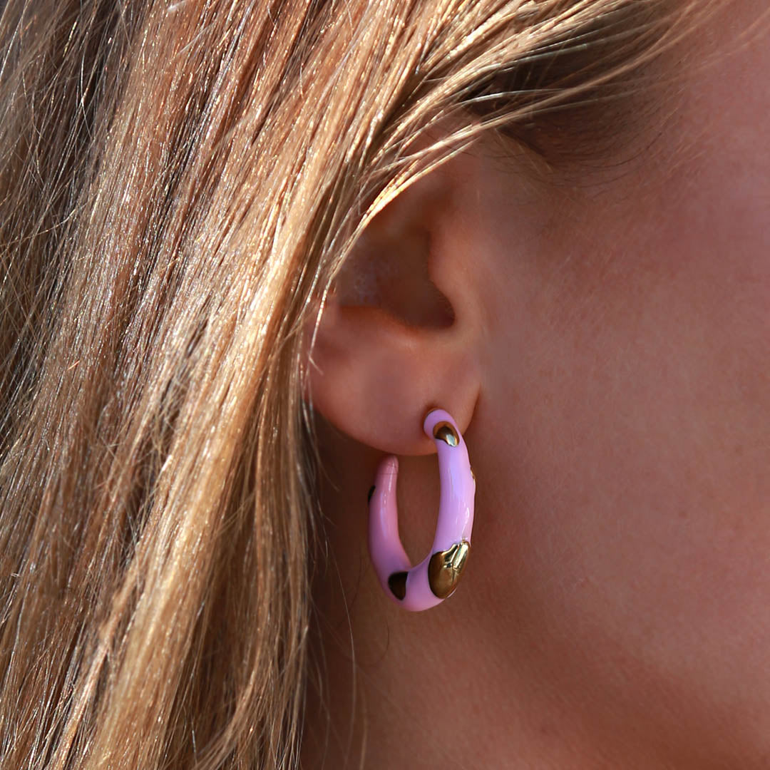 Verleihen Sie Ihrem Sommerlook mit diesen auffälligen goldenen Statement-Ohrringen, die mit warmen rosa Akzenten und einem Hauch von Ibiza-Flair veredelt sind, einen strahlenden Glanz.