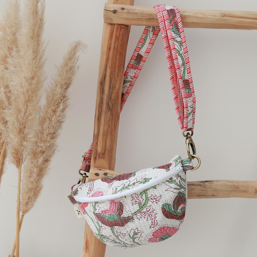 Schöne Umhängetasche in einem tollen handgefertigten Blockdruck. Die Tasche hat einen passenden Reißverschluss und einen verstellbaren Griff.