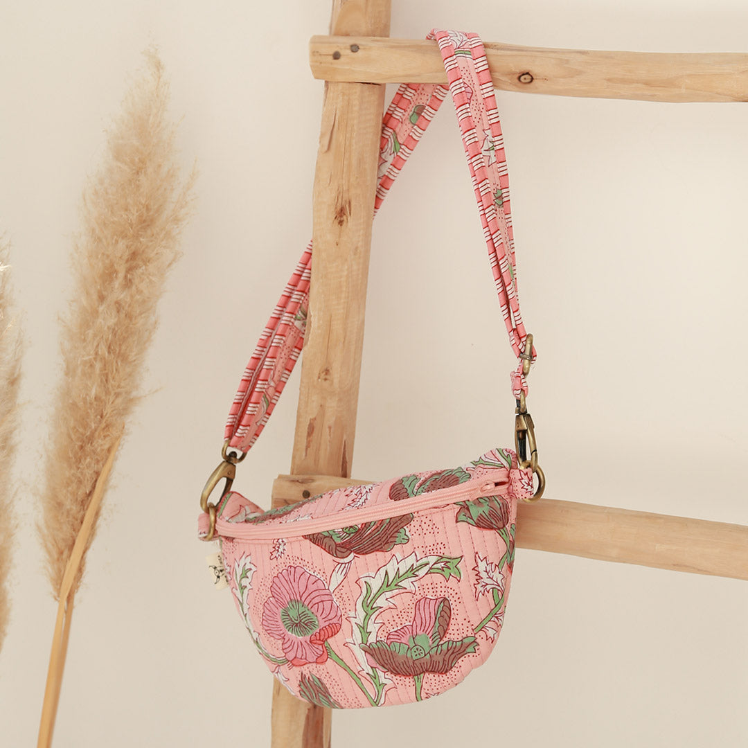 Schöne Umhängetasche in einem tollen handgefertigten Blockdruck. Die Tasche hat einen passenden Reißverschluss und einen verstellbaren Griff.
