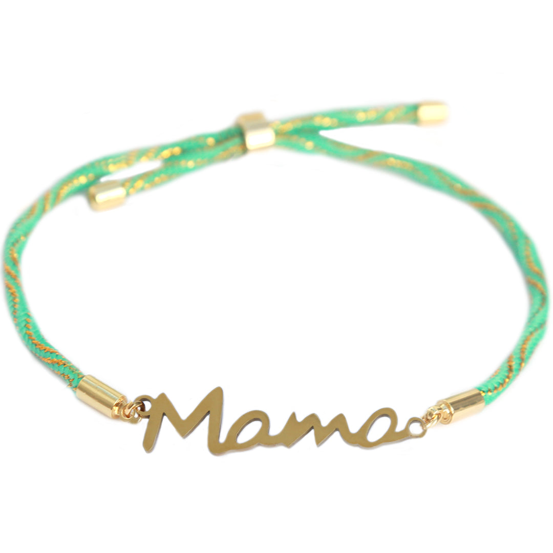 Beautiful bracelet with a turquoise colored cord and a gold charm with the letters 'mama'.