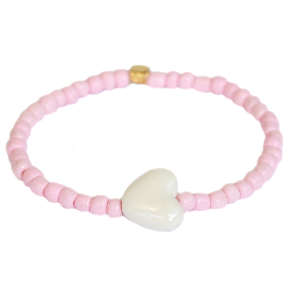 Beautiful pink beaded bracelet with a ceramic heart charm! The bracelet is made with elastic.