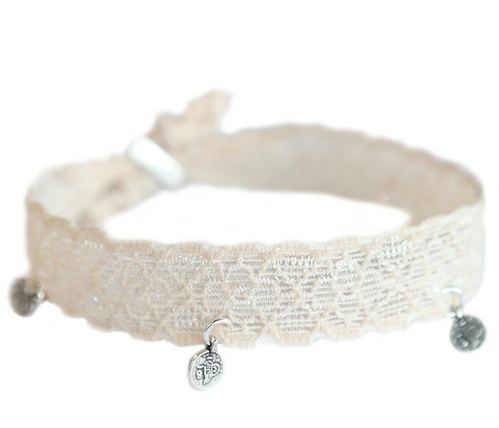 This cream-colored lace ankle bracelet features beautiful silver-plated coin charms.