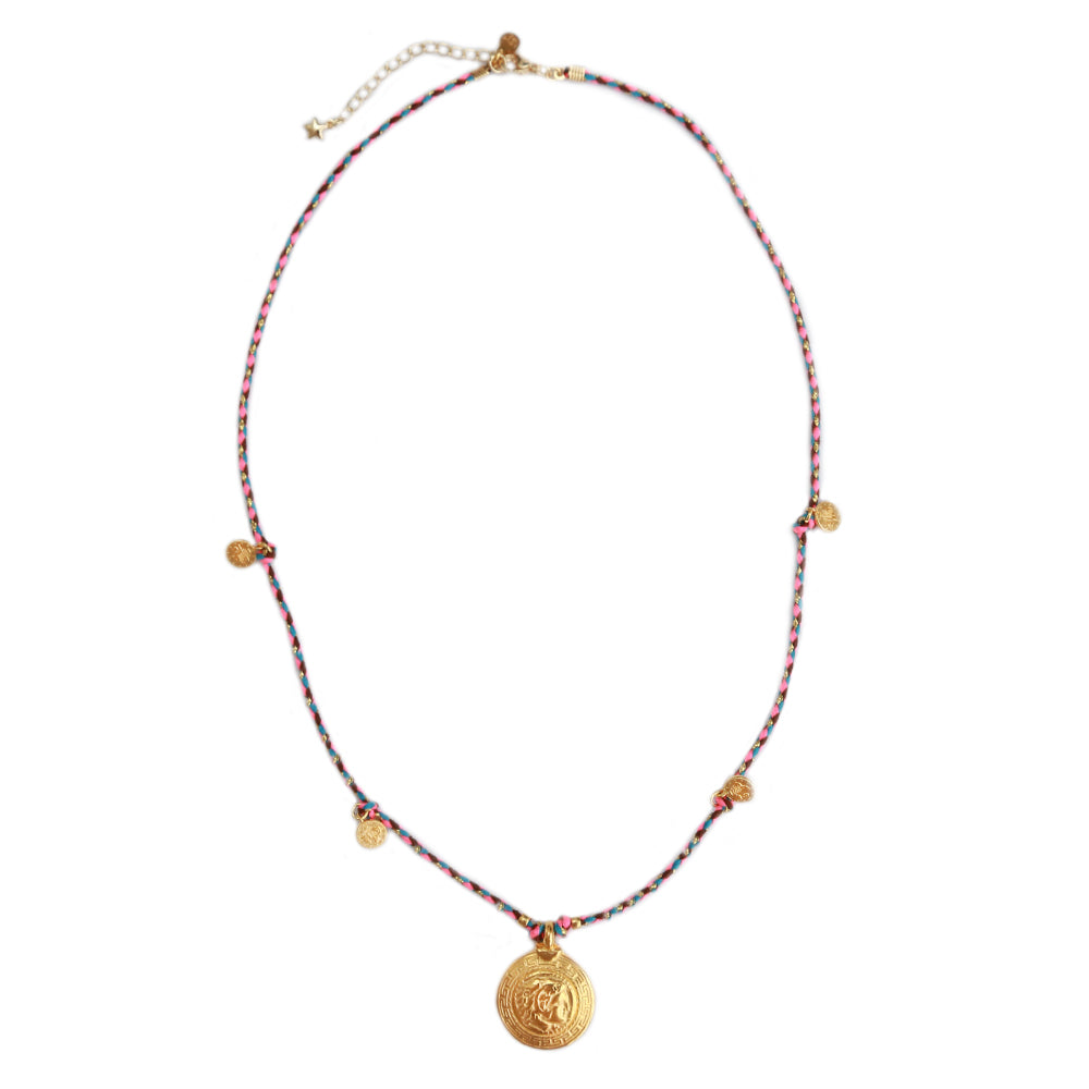 Playful necklace of colored rope with an amulet charm and small gold coins. The necklace comes with a nice card!