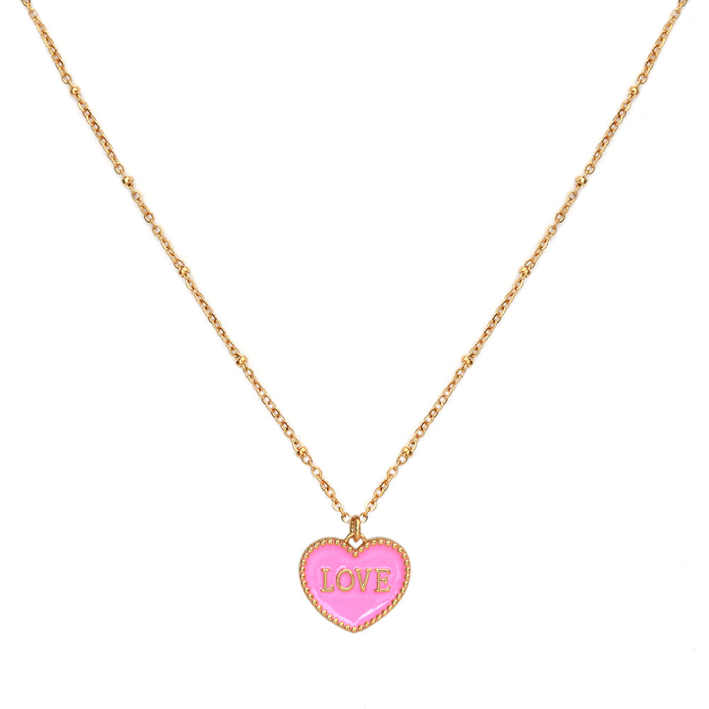 Collar de oro con un bonito dije de corazón con la palabra "LOVE". ¡El collar incluye una preciosa tarjeta! Material: Cadena de acero inoxidable y dije chapado en oro. Dimensiones: El collar mide 45 cm de largo.