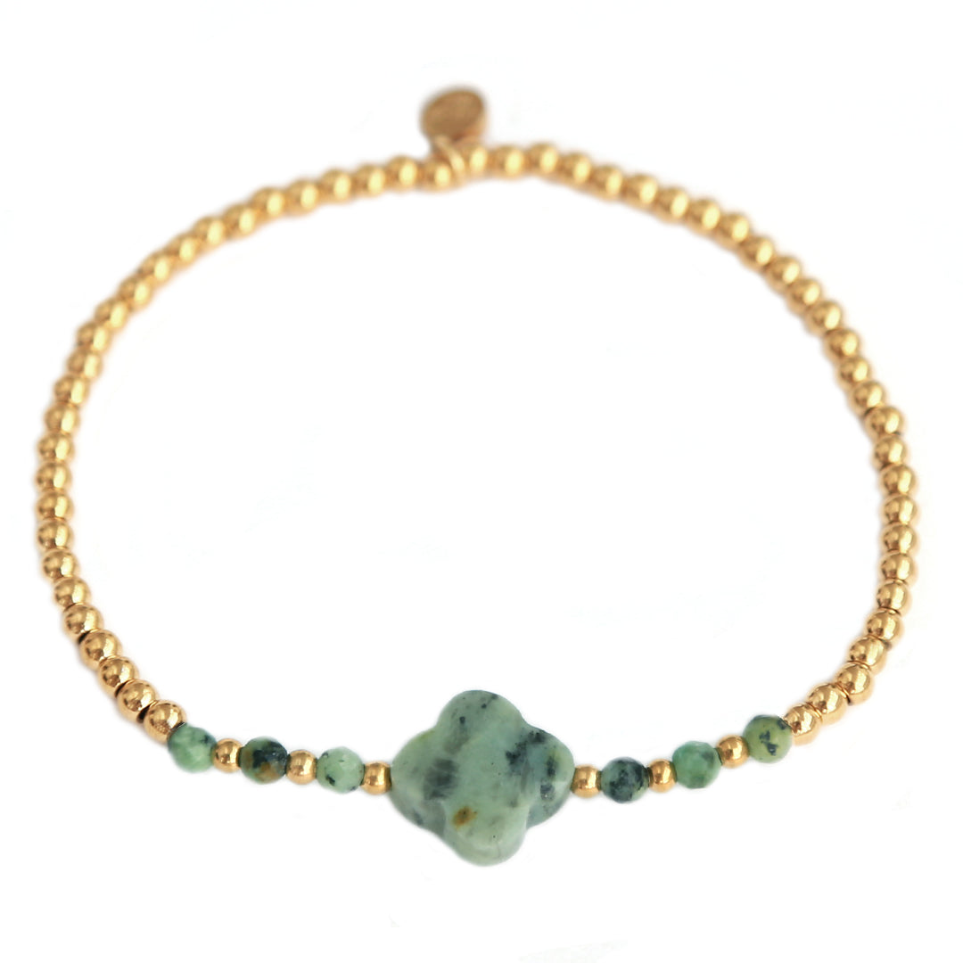 Mooi goud met roze kralenarmbandje met een leuke klaver bedel.