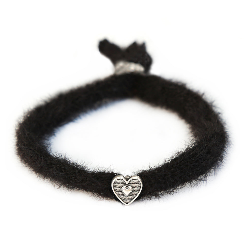 Leuke zwarte fluffy armband met een hartjes bedel en schuifkraal.