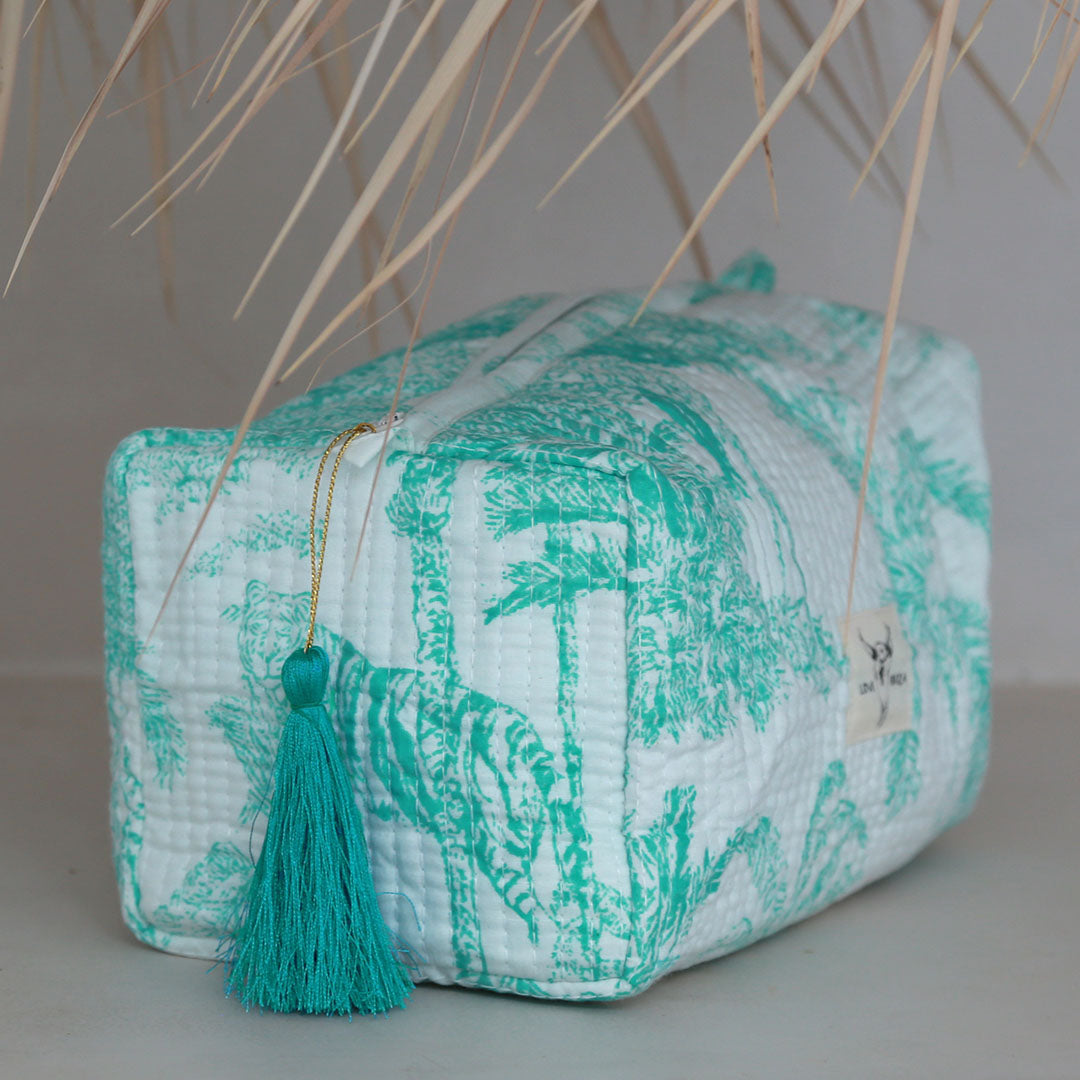 In deze kleurrijke blockprint katoenen toilettas kun je al je toiletartikelen en makeup overal mee naartoe nemen....