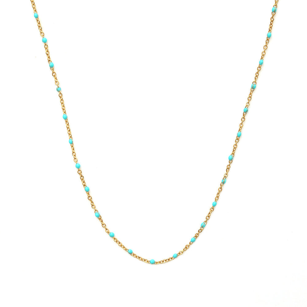 Subtiele gouden chain ketting met kleine turquoise steentjes. De ketting is mooi te layeren met wat langere kettingen!