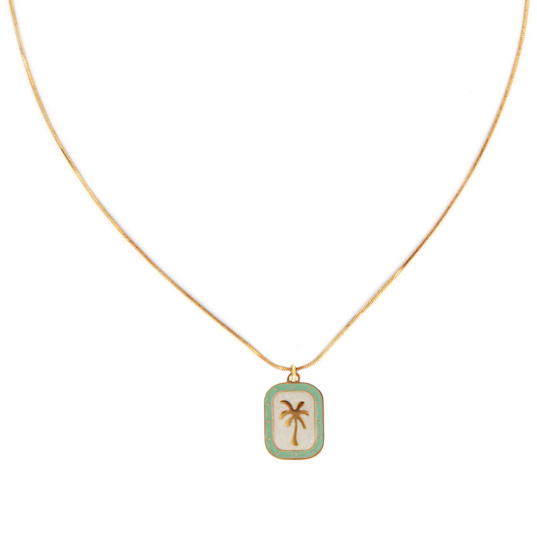 Leuke gouden ketting met een mint kleurig bedeltje en een palmpje.