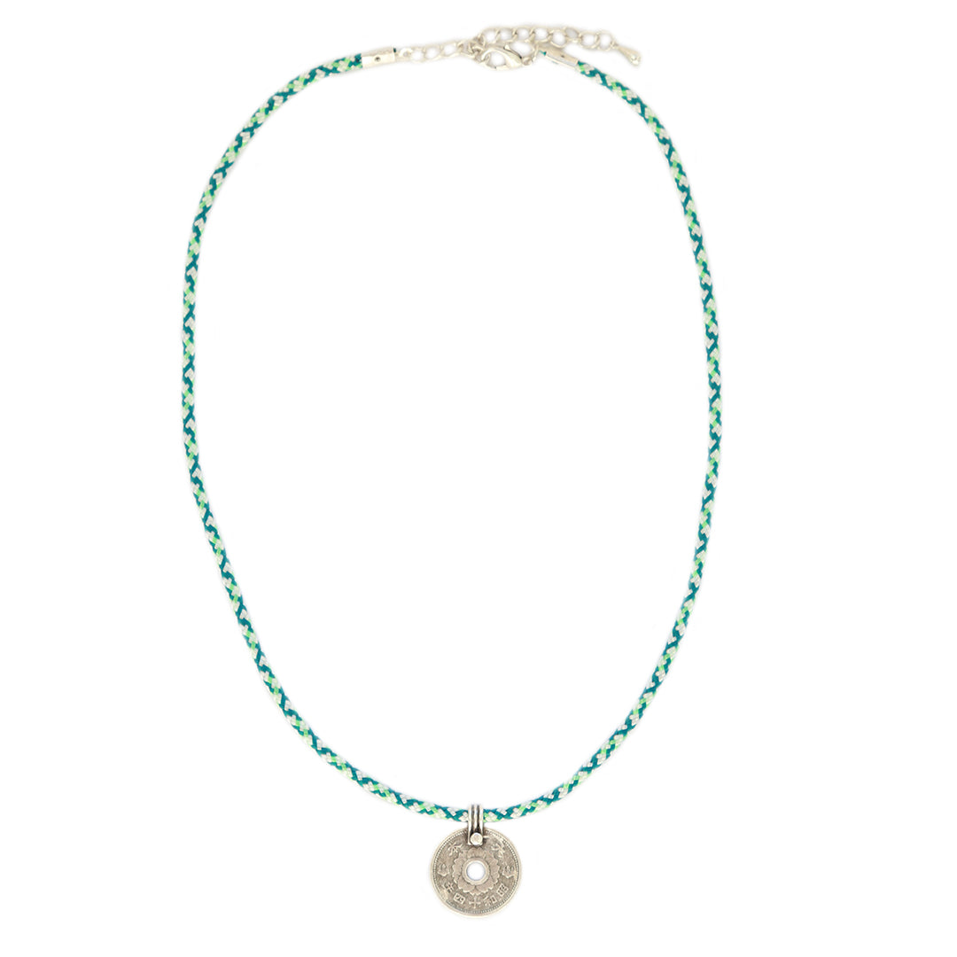 Leuke ketting van gekleurd koord en een zilveren bedel.
