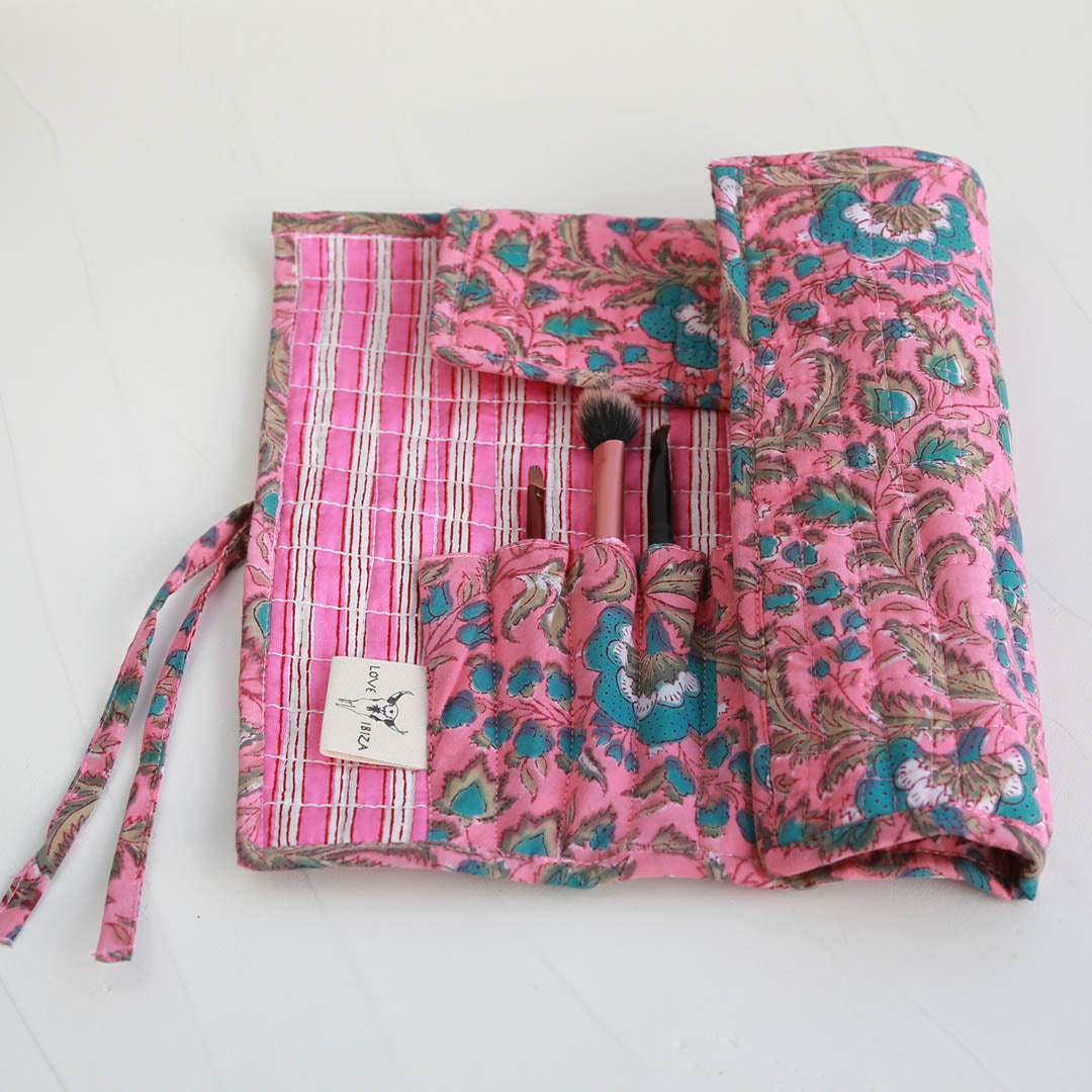Deze make-up kwasten rol is een geweldige manier om uw penselen schoon, opgeborgen en georganiseerd op één plek te houden. Met de hand gemaakt in een mooie blockprintstof, met veel vakjes om je dikke en dunne penselen handig in op te bergen.