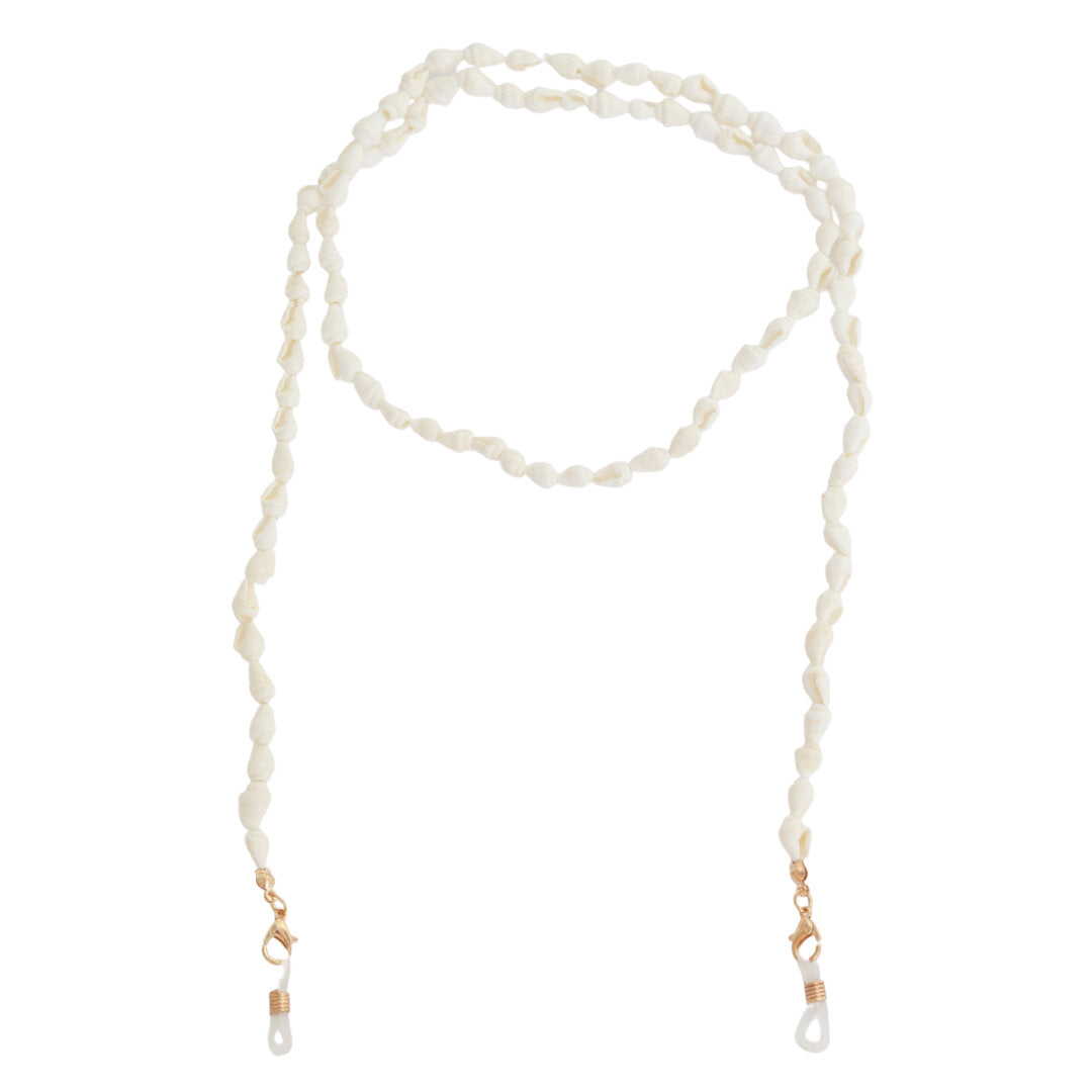 Zomers wit zonnebrilkoordje van schelpkraaltjes. Nooit meer gedoe met het opbergen van je zonnebril, je laat hem gewoon als ketting om je nek hangen!