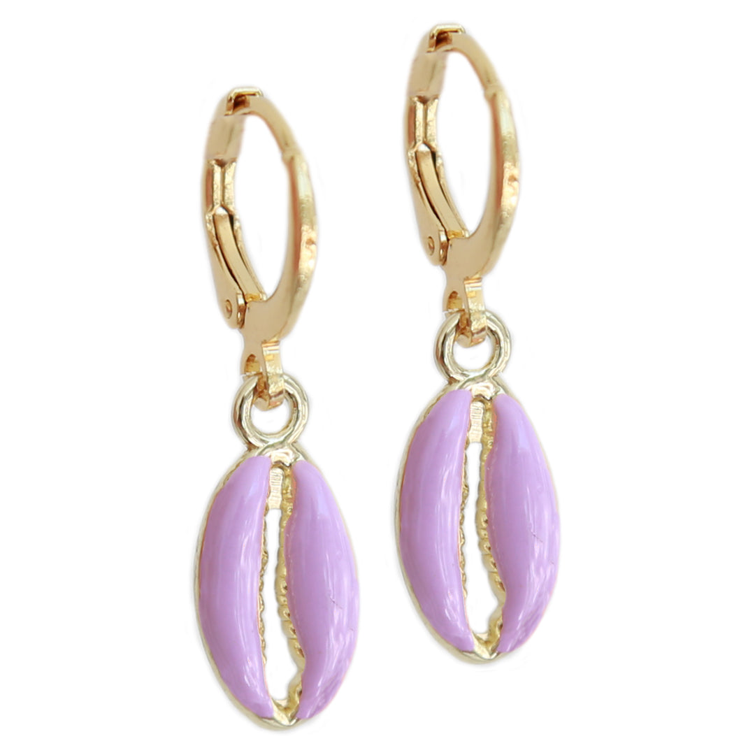 Jolies boucles d'oreilles en or avec une breloque coquillage de couleur violette !