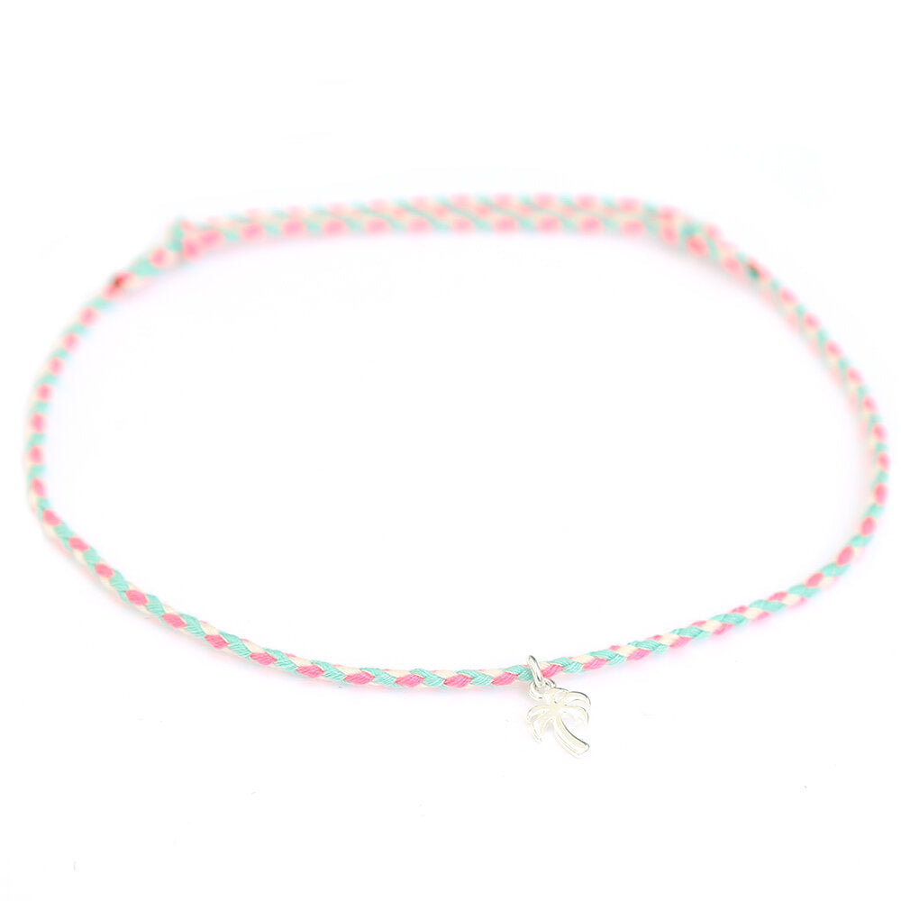 Magnifique bracelet de cheville en coton torsadé turquoise, rose et blanc, orné d'une breloque palmier argentée. Facile...