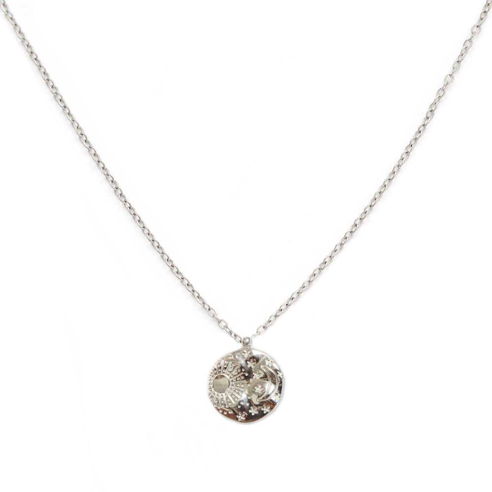 Joli collier en argent avec un imprimé soleil, lune et étoiles.