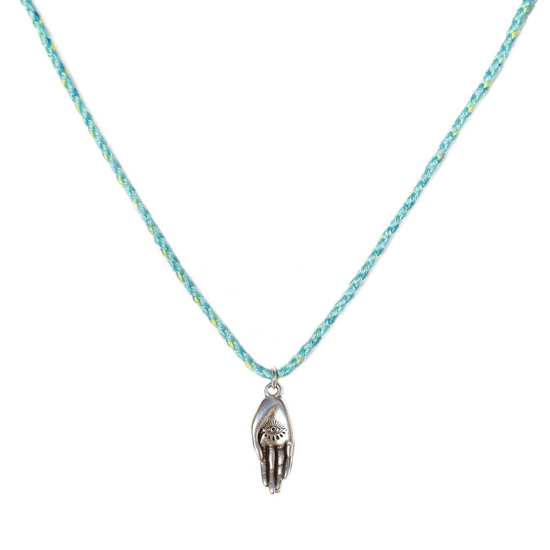 Magnifique collier en cordon torsadé bleu clair avec un pendentif en argent représentant une main de Fatima. Il est accompagné d'une jolie carte !